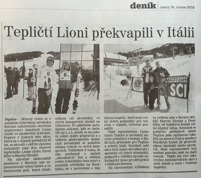 Minulý týden se v italském lyžařském středisku Bormio uskutečnilo otevřené mistrovství italských Lions clubů ve sjezdovém lyžováni. Poprvé v historii této akce, která se v Alpách pořádá již 35 let, se závodů v obřím slalomu zúčastnili také dva členové našeho teplického Lions clubu Pavel Efler a Martin Dlouhý.